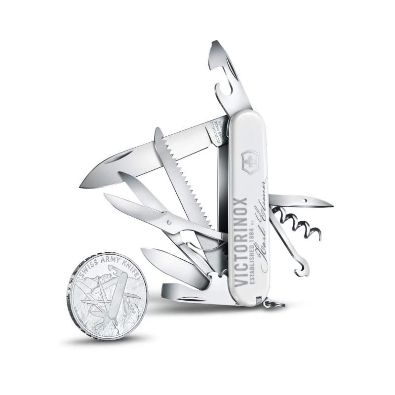 Ce couteau suisse est un modèle de collection unique fabriqué à seulement 8000 exemplaires dans le monde entier. Il est livré dans un sublime coffret cadeau décoré par le portrait de Karl Elsener (1860 – 1918). Le coffret contient bien évidemment le couteau suisse Huntsman blanc, mais aussi une pièce commémorative en argent (20 francs) émise par la Monnaie fédérale Suisse : Swissmint. Il faut également préciser le fait que la pièce commémorative a été dessinée par le graphiste Nadja Baltensweiler. Le coffret contient aussi un certificat d’authenticité très prisé des collectionneurs.