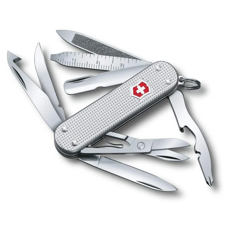 Voici le couteau suisse Victorinox Minichamp dans sa version alox argentée pour une allure toujours plus moderne. Très classe, ce canif onglier est petit par la taille (longueur 58mm) mais grand par l’efficacité avec à sa tête de nombreuses fonctionnalités utiles au quotidien. Vous avez un problème ? Alors le Victorinox Minichamp Alox sera en mesure de vous venir en aide grâce à ses outils très performants. Décapsuleur, tournevis, lime, règle, ciseaux, coupe papier, lame personnalisable, autant d’outils que vous retrouverez sur le couteau suisse Minichamp alox. À noter que le détail des fonctionnalités est expliqué très clairement à l’aide d’un schéma ci-dessous.