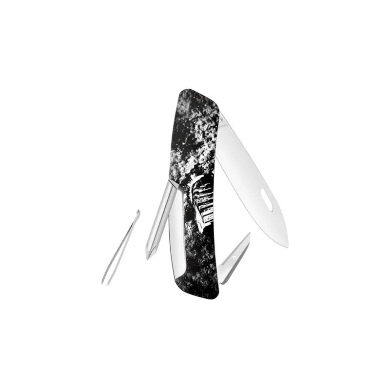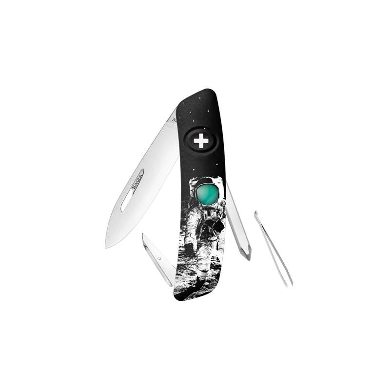 Le 21 juillet 2019, on fêtera les 50 ans du premier pas sur la lune durant la célèbre mission Apollo 11. Et c’est l’astronaute Américain Neil Armstrong qui est le premier homme a avoir réalisé cet exploit. Ce couteau suisse Swiza D02 Moonwalk 50 fait justement référence à cela avec son design spatial. Noir, le manche toujours de forme incurvée pour une meilleure ergonomie est décoré par un astronaute dans l’espace en combinaison spatiale. Un clin d’œil évident au 21 juillet 1969, date où le premier pas a été posé sur la lune. Soucieux du détail, on peut aussi apercevoir, des points lumineux faisant penser à des étoiles ou corps célestes. Enfin au verso, on peut observer une emprunte de pas très réaliste prouvant bien qu’un pied humain a été posé sur la lune.