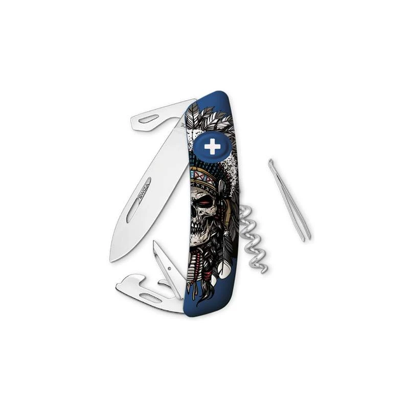 Ce couteau suisse Swiza D03 Indian Skull vaut le coup d’œil, et c’est le moins que l’on puisse dire. De couleur bleue nuit, il est décoré par une tête de mort sur quasiment toute la hauteur, elle comporte une coiffe Indienne reconnaissable par ses nombreuses plumes. Une belle décoration aussi attrayante qu’effrayante ! On remarque qu’à l’intérieur du motif crâne Indien, se trouve un bouton croix faisant office de système de blocage de sécurité. Il permet d’empêcher que la lame ne vienne se refermer en utilisation, très pratique et tellement efficace !