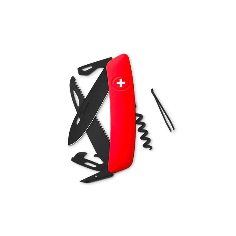 Comme tous les couteaux suisses Swiza, le modèle D05 ALLBLACK rouge est muni d’un manche de forme incurvée pour que la prise en main soit optimale. Il est vrai que l’ergonomie a toujours été au cœur des préoccupations de la marque Suisse Swiza. C’est pour cette raison que tous les outils avec revêtement noir sont équipés de découpes assurant des ouvertures faciles et rapides. Dans le premier paragraphe, on avait évoqué le verrouillage de la lame, il se fait de façon très simple, en appuyant sur le bouton croix situé sur le manche de couleur rouge.