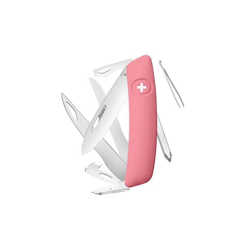 Voici le couteau suisse Swiza modèle D08 Scissors habillé d’un manche rose. En regardant le couteau, on comprend très vite qu’il se destine aussi bien aux femmes qu’aux hommes simplement du fait de son manche rose incurvé, question d’ergonomie et de prise en main. La paire de côtes est décorée par une croix blanche qui sert en réalité au blocage de la lame (sécurité en utilisation ou pendant le transport). Grâce au petit gabarit du Swiza D08 rose (95mm pour 110 grammes), hommes et femmes ne rencontreront aucune difficulté pour transporter le couteau suisse au quotidien. Comme vous le verrez dans le prochain paragraphe, c’est un modèle polyvalent idéal pour l’aventure ou le bricolage.