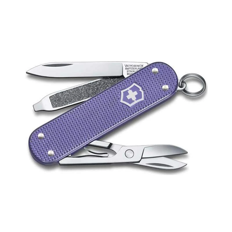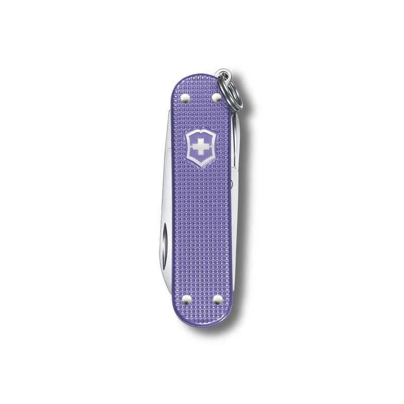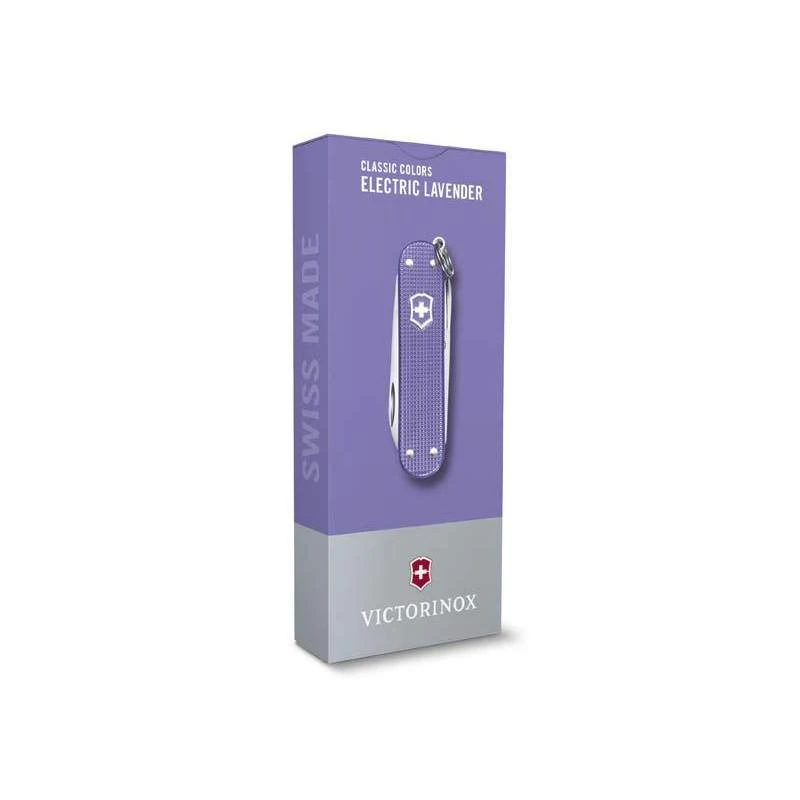 Au cours d’une promenade, nombreux sont les marcheurs à apprécier la beauté de la lavande, mais aussi son parfum envoûtant. Ce couteau suisse Classic 0.6221.223G, à savoir le modèle Electric Lavender, est pourvu d’un manche de couleur bleu lavande. Un beau coloris gris-bleu pâle, qui tire parfois sur le violet, et qui ne sera pas sans vous rappeler d’agréables moments passés en plein air. Notez bien qu’il s’agit d’une paire de côtes alox quadrillé, qui par définition est plus résistante, plus robuste. Le logo croix Suisse Victorinox est présent en blanc, si bien qu’il est parfaitement visible par procédé contraste. Issu de la collection Classic Colors, ce canif Classic alox Victorinox est doté de 3 pièces pour 5 fonctionnalités au total. Lime à ongles, tournevis, paire de ciseaux, petite lame en inox à personnaliser sans oublier un anneau porte-clés pour faciliter le transport du Classic Alox Electric Lavender. Moderne, polyvalent et transportable, c’est toujours un excellent choix !