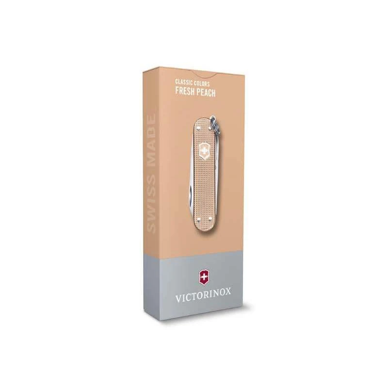 Le monde se modernise au fil du temps, tout comme la marque Suisse Victorinox. Ses plus célèbres couteaux suisses, comme le Classic Alox, sont revisités avec notamment des manches aux couleurs plus audacieuses, plus éclatantes. C’est d’ailleurs exactement le cas pour ce modèle Classic Alox Fresh Peach dont la référence est la suivante : 0.6221.202G. Mesurant 58mm de long, son manche en alox quadrillé est doté d’une teinte rose pêche, un coloris rose clair des plus élégants qu’on ne rencontre que très rarement. Mentionnons également la présence de la croix Suisse Victorinox qui n’est autre que le logo du fabricant. Le couteau suisse Classic Alox Fresh Peach n’est pas que design, il est aussi très fonctionnel à l’aide de ses 5 outils tels que la lame, la lime à ongles, les ciseaux, le tournevis et l’anneau de transport. Une courte lame que vous pourrez graver par une petite inscription, celle de votre choix. Autres coloris modernes disponibles sur la boutique !