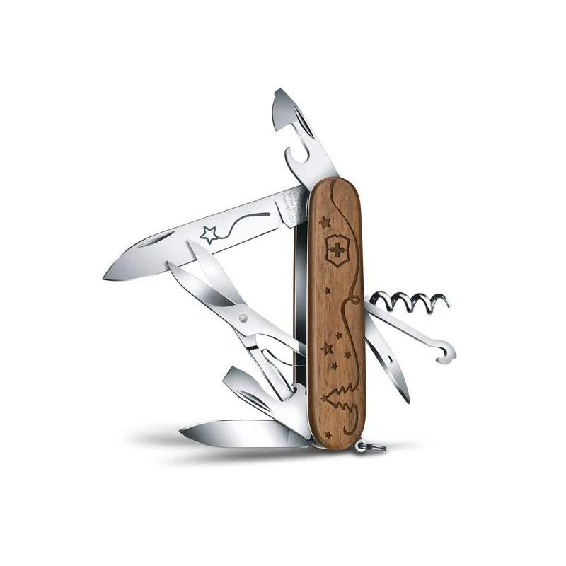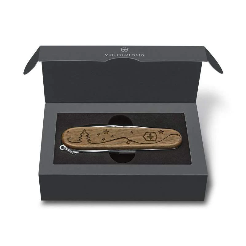 La gamme All You Wish For, signée Victorinox, est une édition limitée 2020 qui va énormément plaire, notamment à celles et ceux qui adorent l’ambiance festive, magique, des fêtes de fin d’année, ou plus largement de l’hiver. Le manche de longueur 91mm de ce Victorinox Climber Wood 1.3704.63E2 est fabriqué en bois noyer. Il est embelli par de beaux paysages d’hiver : on peut notamment observer un sapin, des étoiles … On peut même lire l’année 2020, car il faut rappeler qu’il s’agit ici de l’édition limitée 2020 du couteau suisse Climber Wood All You Wish For.