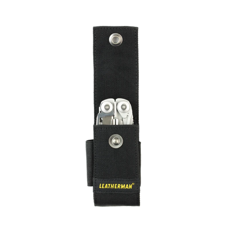 De couleur noire, cet étui de protection Leatherman de taille moyenne est fabriqué en nylon balistique, élastique avec coutures renforcées. Particulièrement robuste, cet étui Leatherman s’ouvre et se referme à l’aide d’un rivet à pression en acier, cela permet de sécuriser l’outil multifonction lors des déplacements et mouvements. Le petit plus de cet étui, c’est qu’il intègre une petite poche latérale permettant d’y loger une lampe de poche ou encore un stylo. De quoi faciliter la gestion de vos aventures ! À noter également la présence du logo Leatherman en jaune sur le devant de l’étui de taille moyenne qui est compatible avec les modèles suivants :