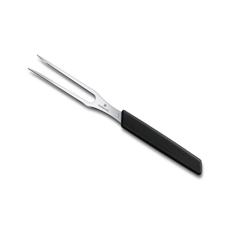 Pour découper efficacement les viandes, il existe un tandem qui fonctionne particulièrement bien : le couteau ainsi que la fourchette à découper. En voici justement une qui appartient à la collection Swiss Modern de la marque Suisse Victorinox. La fourchette à viandes est caractérisée par un manche noir en polyprolylène qui en plus d’assurer une élégance de tous les instants, assure un grand confort d’utilisation. Sa forme est de type géométrique, comme tous les autres ustensiles de cuisine de la série Swiss Modern.