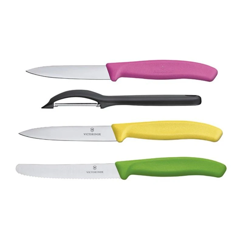 Le coffret Kitchen Tool Box de Victorinox réunit les meilleurs couteaux de cuisine. Contenant 2 couteaux d’offices à lame lisse (un rose lame 8 cm, l’autre jaune lame 10 cm), un couteau à tomates vert lame dentée 11 cm, ainsi qu’un éplucheur universel pèle-tomate noir, avec ce coffret vous êtes prêts pour bien cuisiner ! Vous aurez tous les ustensiles de cuisine nécessaires pour couper et éplucher vos légumes avec rapidité et précision.