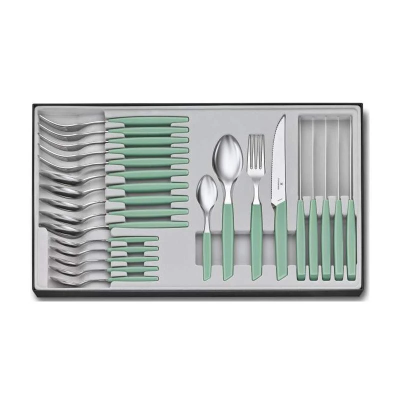Grâce à cette ménagère Victorinox, vous pourrez organiser un repas complet à table, jusqu’à 6 personnes au maximum. De l’entrée jusqu’au dessert, vos convives et invités pourront se régaler non sans élégance grâce aux différents couverts contenus dans la ménagère. C’est au total 24 pièces qui vous attendent de main ferme, elles sont toutes conçues et fabriquées en Suisse par l’excellente marque Victorinox que l’on ne présente plus. Les 24 couverts de table sont fabriqués en acier inoxydable pour la résistance, mais surtout en polypropylène coloris vert pastel au niveau des manches. Il souffle un vent de modernité sur la table de votre salle à manger, ainsi que d’ergonomie car il faut garder en tête que le polypropylène est un matériau ergonomique à la surface antidérapante.