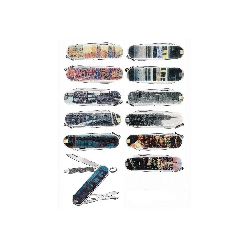 6 canifs ongliers Victorinox aux visuels stylisés de 5 grandes villes (Paris – San Francisco – New York – Tokyo – Shangaï) et celui d’un train de banlieue.