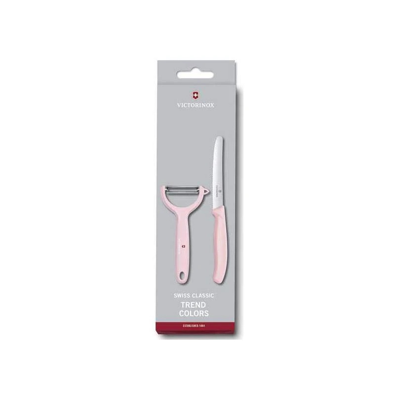 Le couteau ainsi que l’éplucheur rose pastel appartiennent à la collection Swiss Classic Trend Colors Victorinox, une série proposant des ustensiles de cuisine/table ultra-modernes et performants. Un cadeau de choix que vous pourrez offrir sans la moindre difficulté !