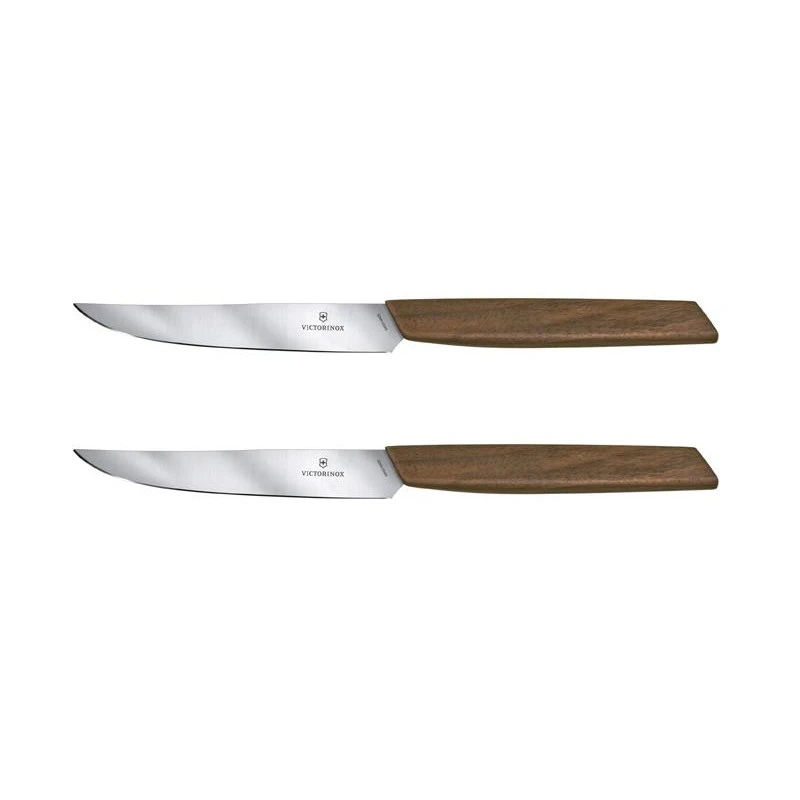 Les deux couteaux à steak Victorinox Swiss Modern avec manche en bois noyer sont livrés en boîte cadeau : de quoi faire plaisir à vos amis fans de beaux couverts de cuisine. Ils s’harmoniseront parfaitement avec une table en bois foncé par exemple … Ils allient élégance, modernisme et efficacité !