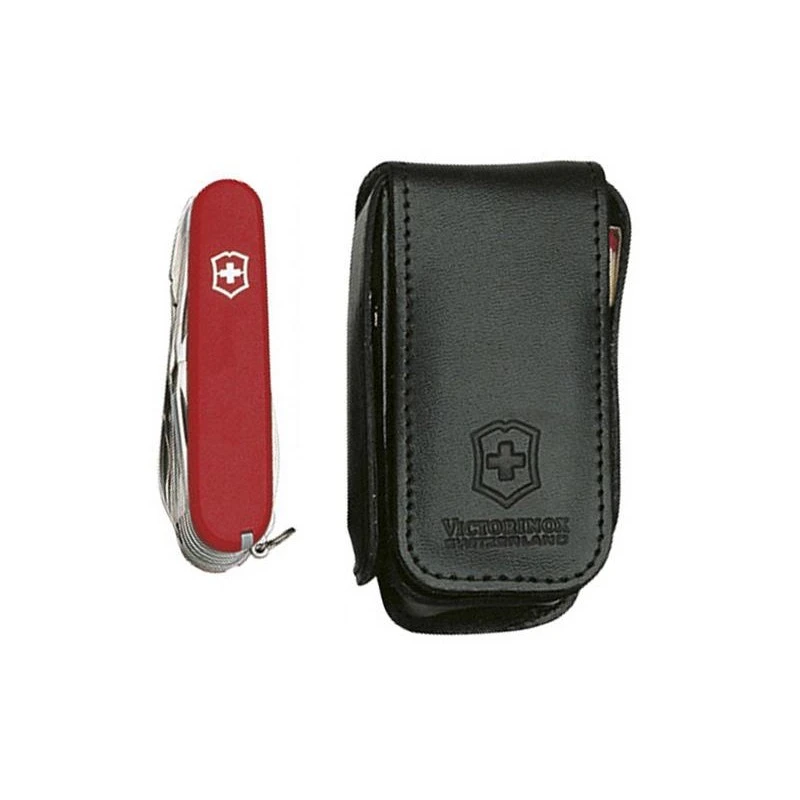 L’avantage du Victorinox Swisschamp est qu’il est facile à transporter de part sa petite taille : seulement 91mm de longueur. De plus, il intègre en bout de manche un anneau en inox pour le montage sur porte-clés : il ne vous quittera plus jamais ! Pour ne pas abîmer votre couteau suisse, un étui en cuir 2 compartiments est également vendu avec le kit.