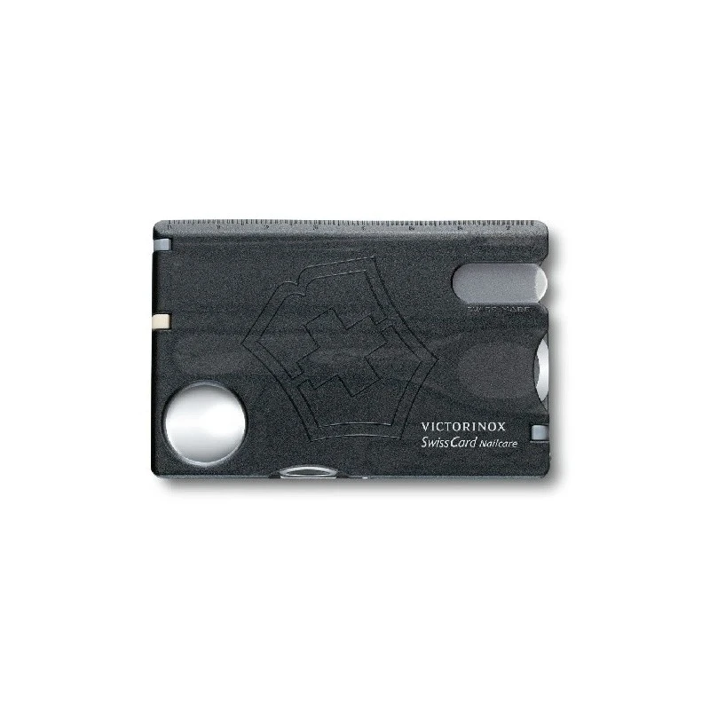 Voici le très célèbre Swissard Nailcare Victorinox qui cette fois n’est pas rouge, mais noir : de quoi conférer à ce couteau suisse en forme de carte de crédit une apparence beaucoup plus moderne et chaleureuse. La carte noire est marquée de la croix suisse sur toute la hauteur ainsi que du texte « Victorinox Swisscard Nailcare » dans le coin inférieur droit. Ce format « carte de crédit » rend ce multifonction très facile à transporter et à ranger au quotidien : il pourra par exemple se loger dans un portefeuille dans l’emplacement réservé aux cartes, l’assurance de toujours l’avoir sur soi.
